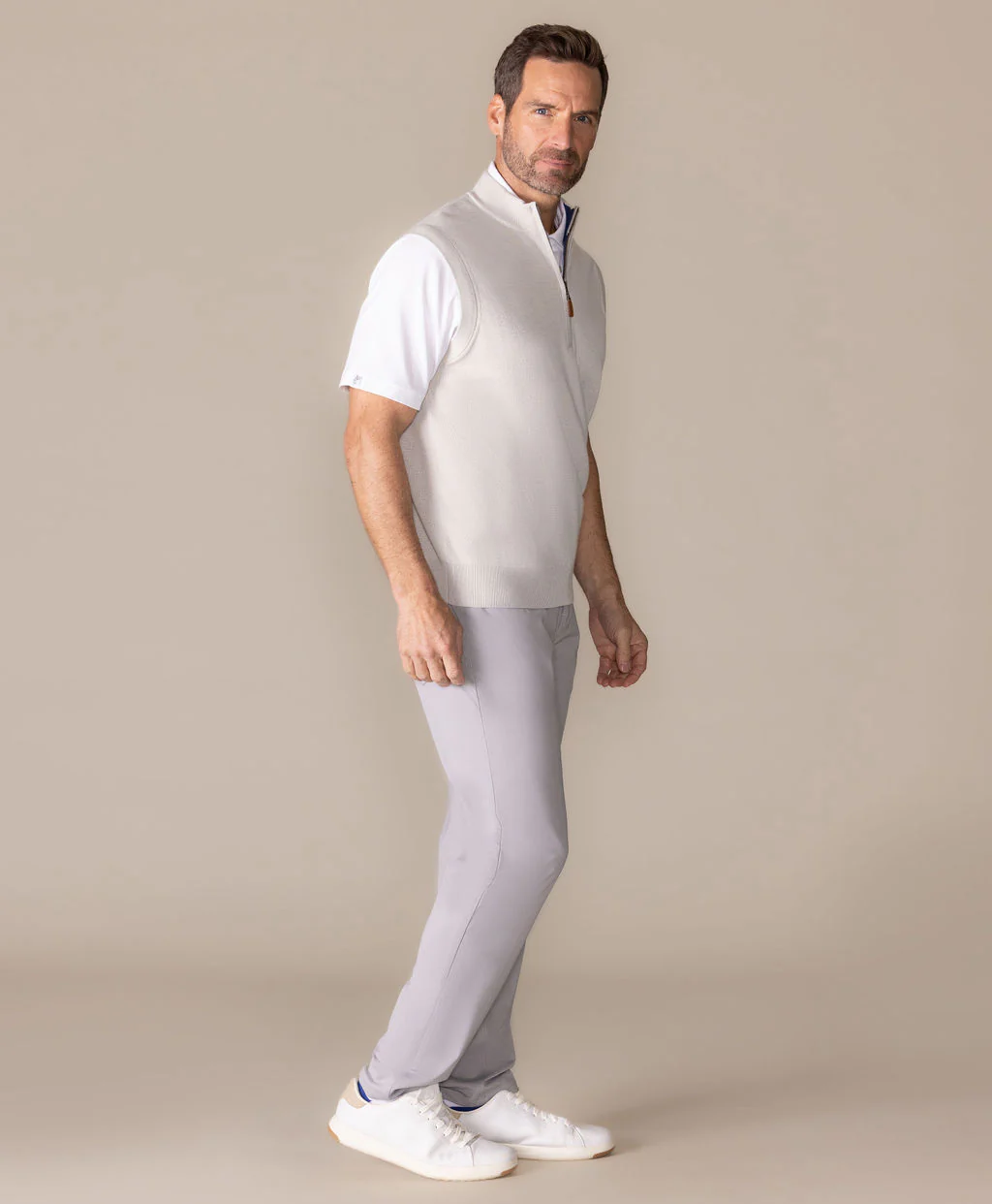 Look cool. Stay warm. This water-resistant vest is a smart blend of Coolmax, cotton, and cashmere, providing lightweight insulation for cooler days. Finished with a special stitch for added stretch.